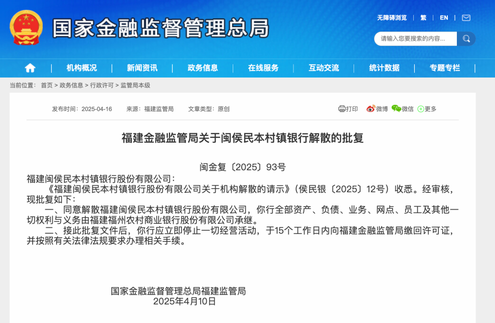 批复文件显示,福建金融监管局于4月10日同意解散闽侯民本村镇银行,该行全部资产、负债、业务、网点、员工及其他一切权利与义务,由福州农商银行承继。