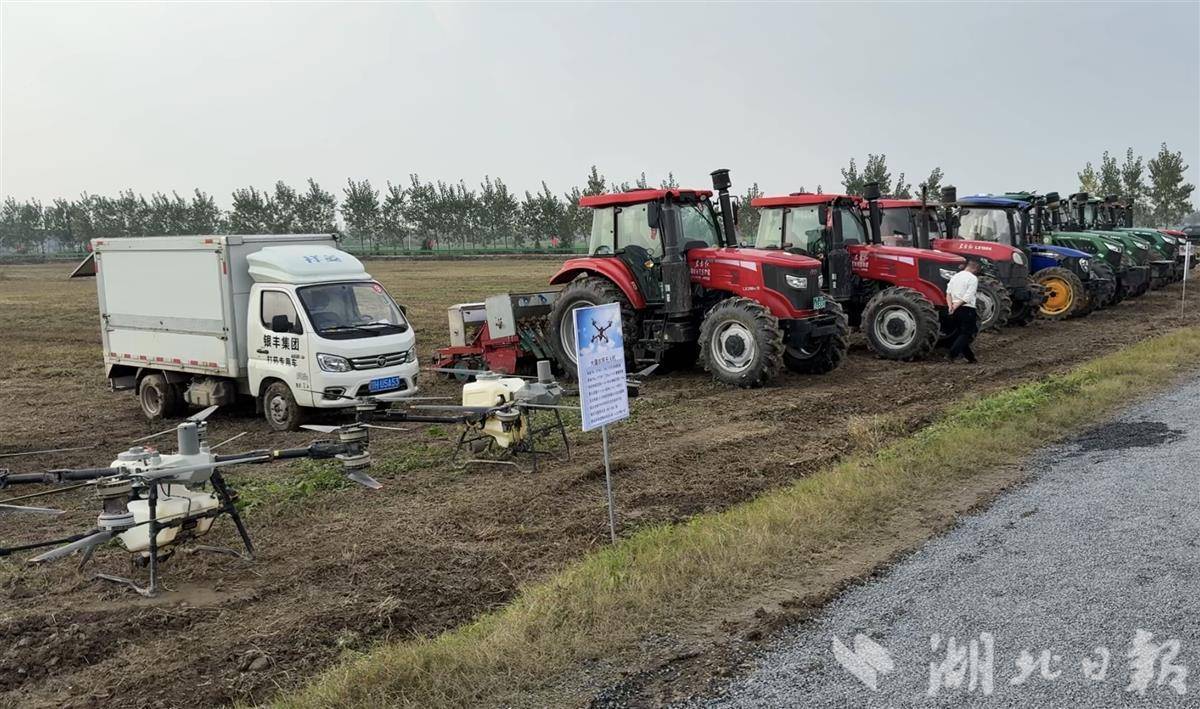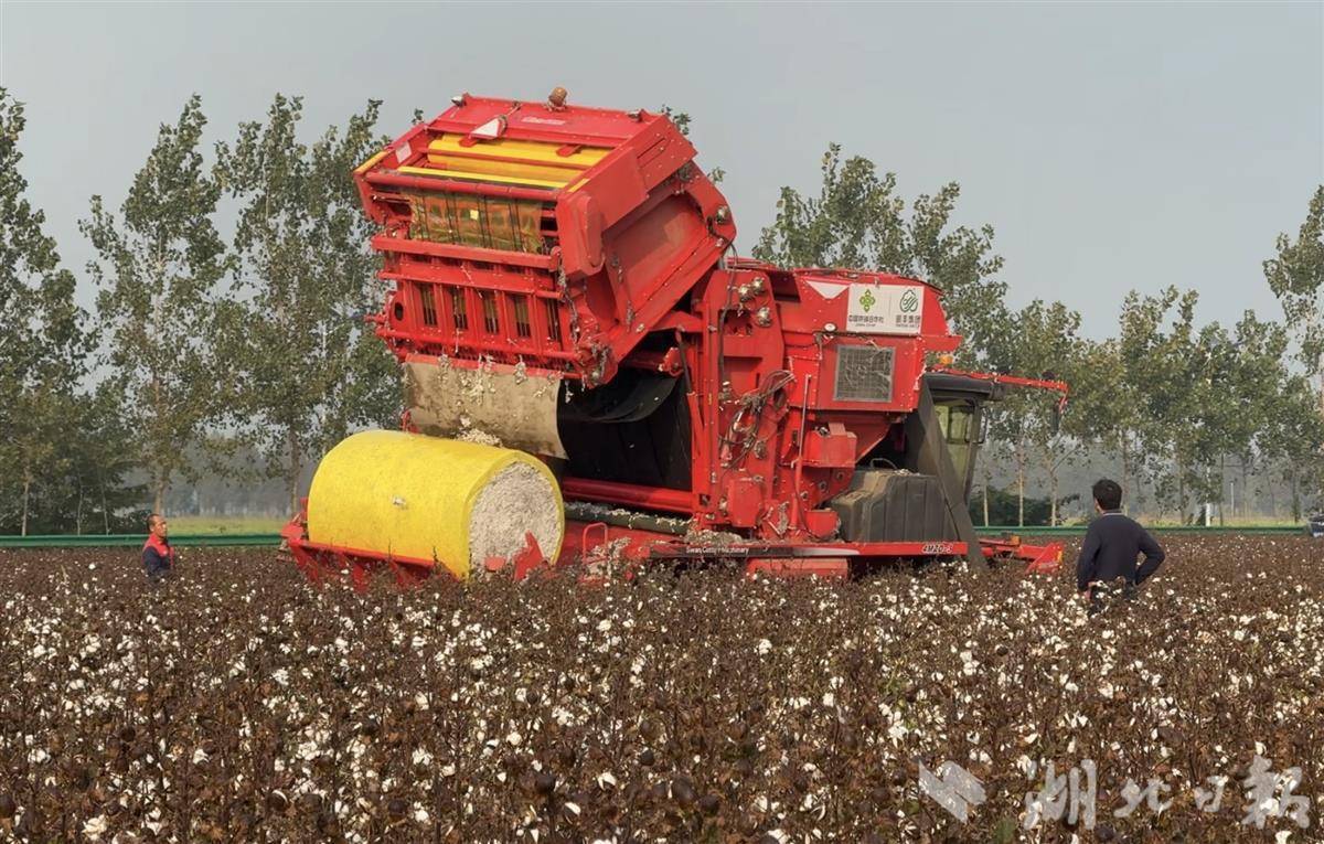 在荆门钟祥市柴湖镇芦席场村,湖北银丰棉花股份有限公司(简称“湖北银丰”)的一块1200余亩的连片棉田里,3台自走式打包采棉机来回穿梭,先后放下几枚2吨重的黄色“棉花蛋”。旁边的田埂上,抛肥机、开沟机、犁地机、旋耕机、播种机、中耕施肥机、喷药无人机、秸秆还田机……棉花从种到收各环节的农机列队。