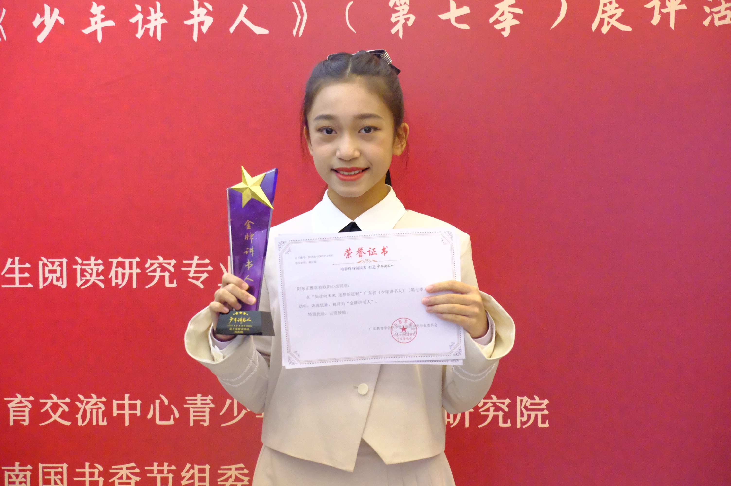 深厚的阅读积累为她打开了更广阔的世界。她被评为广东省“金牌讲书人”、阳江市及阳东区“优秀读书人物”,在区级、市级征文比赛中多次获奖。这些荣誉背后,是她日复一日的坚持与思考。难能可贵的是,她并未将荣誉视为终点,而是作为鞭策自我不断前进的动力。她时刻以“新时代好少年”“优秀少先队员”的标准要求自己,用实际行动在校园内外传递着积极向上的正能量。