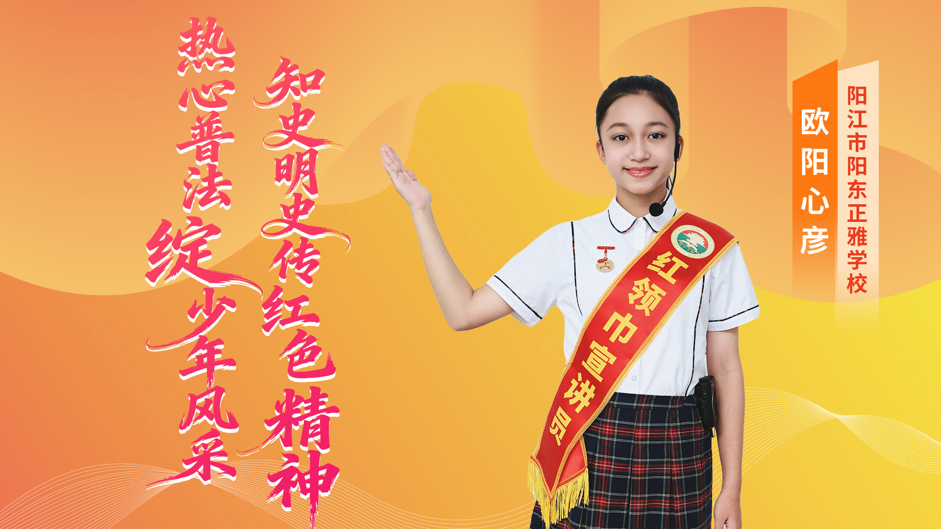 欧阳心彦,女,阳江市阳东正雅学校七年级学生。作为“红色家庭”的后代,她积极传承红色基因,担任“红领巾宣讲员”“南海I号”博物馆讲解员,成为“广东省十佳普法小使者”,多次在省市级讲解员比赛中折桂。她多才多艺,曾荣获广东省“金牌讲书人”、阳江市“优秀读书人物”等称号,在省市各级征文、英语朗读比赛中屡获佳绩。2025年她入选广东“新时代好少年”先进事迹发布名单,并作为阳江市唯一少先队员代表,出席了第九次全国少代会。